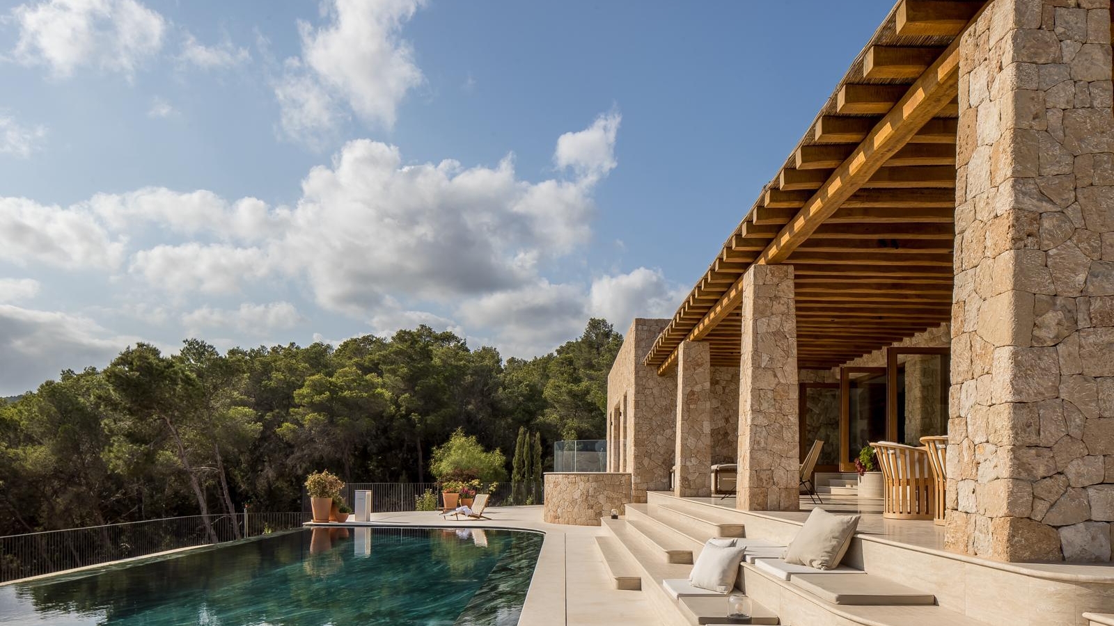 Large openings and uninterrupted sightlines ensure a constant dialogue between interior and exterior spaces. From the living areas, the eye is naturally guided toward the pool, terraces and outdoor dining zones framed by century-old Sabina trees, forested hills and glimpses of the Mediterranean beyond.